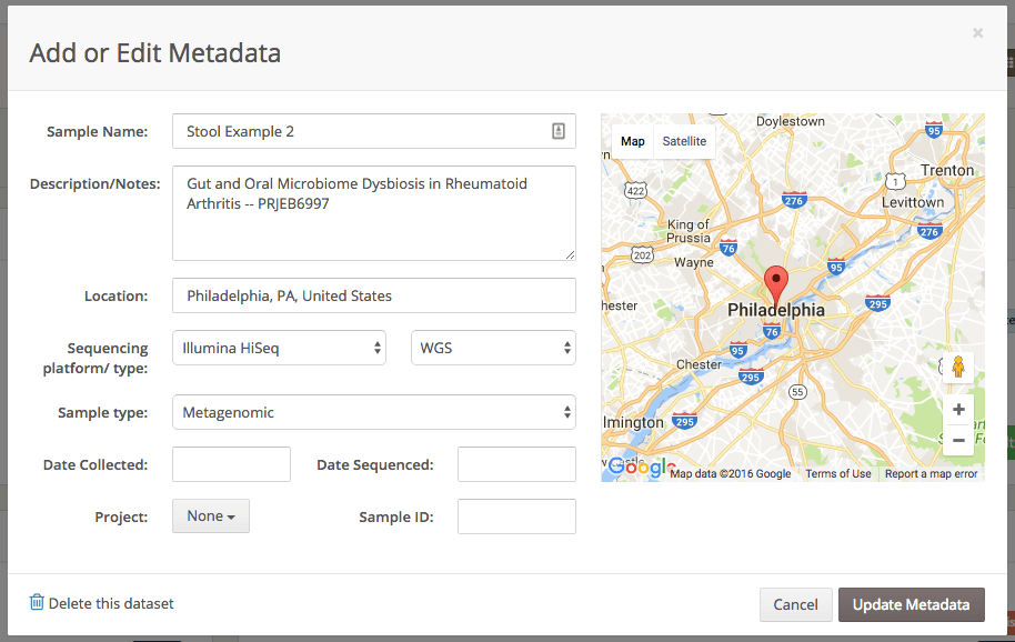 The metadata editing modal on the One Codex web application. Note that the Project is actually a property on the Sample resource.