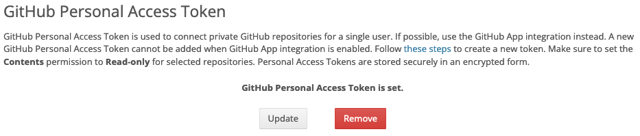 If you have connected via the GitHub app, returning to your settings page, you will see a button to remove the GitHub App integration. Note that this does not uninstall the app from GitHub. You can uninstall from GitHub by visiting your GitHub installations page.